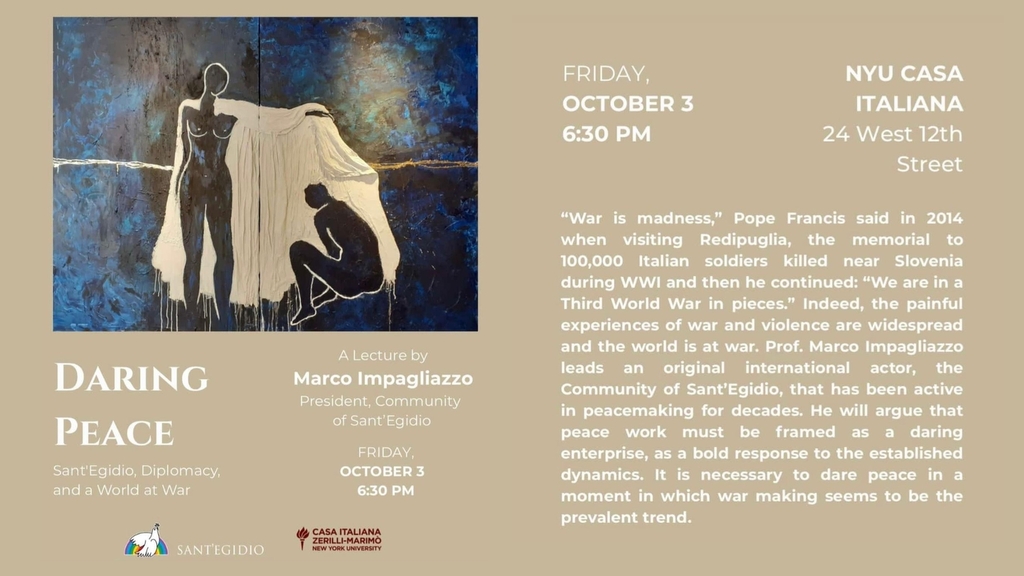 Marco Impagliazzo presents Sant’Egidio’s commitment to peace at NYU On Friday, October 3 at 6:30 PM, at the NYU Casa Italiana Zerilli-Marimò (24 West 12th Street, New York), the President of the Community of Sant’Egidio, Marco Impagliazzo, gives a lecture entitled “Daring Peace. Sant’Egidio, Diplomacy, and a World at War”. In Redipuglia in 2014, Pope Francis said that […]